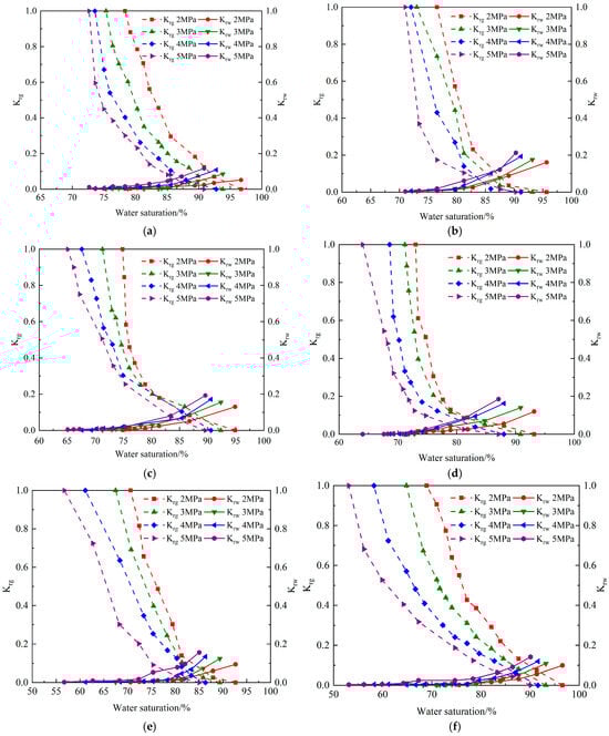 Gas–water relative-permeability curve. (a) Sample 1; (b) Sample 2; (c) Sample 3; (d) Sample 4; (e) Sample 5; (f) Sample 6.
