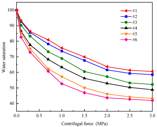 Under the same centrifugal force, as the permeability of the core increased, the water saturation decreased. For example, when the centrifugal force was 3 MPa, the water saturation of the six core samples was 60.58%, 58.56%, 52.21%, 48.83%, 43.28%, and 41.93%, respectively. Core samples with higher permeability were more sensitive to changes in water saturation due to their well-developed pore structures, which offered less resistance to fluid flow. As a result, water was more easily expelled under the same centrifugal force. In contrast, rock cores with lower permeability were less sensitive to changes in water saturation because their complex pore structures significantly hindered fluid flow.