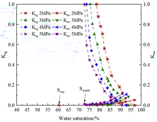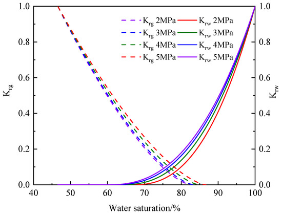 As shown in Figure 6, the variation in fluid permeability within the core of tight sandstone was revealed. It can be seen that, with the increase in water saturation, the relative permeability of the water phase gradually increases, while the relative permeability of the gas phase shows an exponential upward trend. This phenomenon may be due to the fact that, under high-water-saturation conditions, most of the pore space is filled with water, which restricts gas flow. As the water saturation decreases, the connectivity between pore spaces improves, resulting in more open channels for gas to flow. This is due to the reduced capillary forces holding the water within the pore throats, which allows gas to flow more freely through previously constricted pathways. This increase in gas flow capacity is directly related to the rapid increase in the relative permeability of gas.