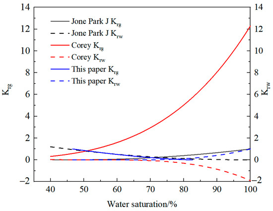 To validate the accuracy of the proposed normalization method, a comparison was conducted with existing normalization models, including the Jone Park J model and Corey model. The result is shown in Figure 15. The Krg values in the Jone Park J model exceed 1, and the Krw values in the Jone Park J and Corey models fall below 0, both of which introduce significant errors. These discrepancies indicate that these models are not suitable for characterizing the gas–water relative permeability of high-water-content tight sandstone reservoirs. In contrast, the proposed normalization approach effectively eliminates inconsistencies across different samples and ensures a standardized representation of the reservoir’s permeability characteristics. This study established a robust normalization method for the gas–water relative-permeability curve of high-water-content tight sandstone gas reservoirs, which improved the accuracy of reservoir characterization and development planning. The normalized relative-permeability curve can be integrated into reservoir simulation models to more accurately predict fluid flow behavior and reservoir performance. This is crucial for optimizing development strategies such as well spacing, production rate, and injection schemes, which can help to improve gas recovery and reduce operating costs.