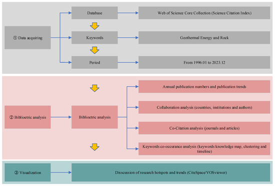 While prior reviews focus on technical aspects of EGS, a systematic analysis quantifying global collaboration patterns, interdisciplinary linkages, and policy-driven trends in HDR research is absent. Bibliometric analysis, as a scientific research method, enables the statistical analysis of a large volume of literature data, revealing the overall development trends, research hotspots, and technological evolution within a specific field [35,36]. Through bibliometric analysis, researchers can identify the key research directions, leading institutions, and high-impact academic contributions in a particular area, providing a scientific basis and reference for future research. In the context of geothermal energy, especially HDR, bibliometric analysis can help us understand the current state of research and uncover potential future directions and challenges. This study aims to systematically analyze the research on geothermal energy, particularly HDR, using bibliometric methods to reveal the research trends, hot topics, and future development directions in this field. By comprehensively evaluating international and Chinese studies, this paper will provide scientific references for the effective development and utilization of geothermal energy, supporting global efforts to achieve low-carbon energy transition goals. Throughout this process, the study will not only examine the theoretical advancements in geothermal energy and HDR research but also focus on key issues and development bottlenecks in technological applications. By delving deeply into the literature data, this research will identify critical areas that require attention in future studies and offer guidance and decision-making references for professionals in the field.