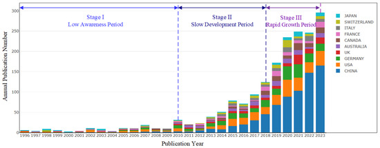 In analyzing the collected literature data, this study employed a range of bibliometric tools to conduct comprehensive statistical and visual analyses [39,40]. These tools include Bibliometrix (version 4.0.0), CiteSpace (version 6.1.R3), and VOSviewer (Version 1.6.19). Bibliometrix, an open-source package developed in R (Version 4.23), is specifically designed for bibliometric analysis and visualization. It generates various bibliometric indicators, such as annual publication trends, the distribution of publications by leading countries and institutions, journal distributions, author collaboration networks, and keyword co-occurrence analyses. Through Bibliometrix, researchers can systematically analyze different dimensions of the literature data, revealing research trends and hotspots within the field. CiteSpace, a Java-based bibliometric software, is primarily used to detect research frontiers and emerging trends in scientific literature. CiteSpace analyzes citation networks, keyword co-occurrence networks, and author collaboration networks, providing a dynamic visualization of the evolution of scientific knowledge [41]. Its powerful visualization capabilities allow researchers to identify key nodes and burst hotspots in the research domain. VOSviewer is a tool specialized in constructing and visualizing bibliometric networks, particularly effective for displaying keyword co-occurrences and the collaboration relationships between institutions and authors in large-scale literature data. With VOSviewer, researchers can generate detailed network maps that visually represent the knowledge structure and academic collaboration within the research field. CiteSpace was selected for its strength in detecting emerging trends through citation burst analysis, while VOSviewer’s clustering algorithms effectively visualized keyword co-occurrence networks.