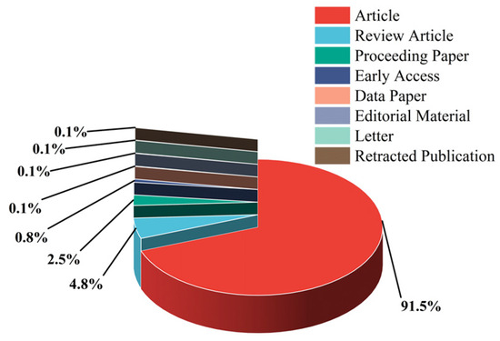 Figure 3 presents the characteristics of document types in the field of HDR geothermal research. Among the 1927 collected documents, 1764 (accounting for 91.5% of the total) are research articles. These articles provide extensive experimental data, theoretical analysis, and empirical studies, forming the primary basis for further analysis in this field. Additionally, 4.8% of the documents are review papers, which summarize and synthesize existing research findings, offering comprehensive background knowledge and research frameworks for researchers. Progress papers constitute 2.5% of the total, typically providing a quick overview of recent advances in a specific research area, showcasing the latest developments and technological breakthroughs. Early access papers account for 0.8%, representing emerging research hotspots that are in the early stages of investigation and contain cutting-edge content. Data papers, making up only 0.1% of the total, mainly provide original datasets or data analysis results, serving as valuable references for further research.