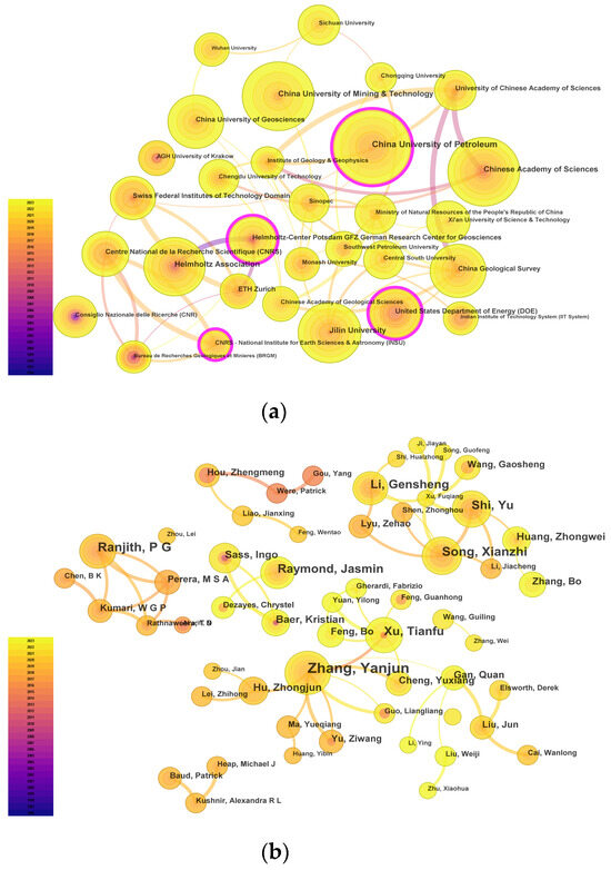 Figure 5a and Table 2 present the ten most influential research institutions in the field of HDR geothermal energy research, including their respective countries, total publication counts, centrality, and the year they first began research in this domain. These institutions have played pivotal roles in global HDR geothermal energy research, contributing significantly to the field’s development through a substantial volume of high-quality research outputs. China University of Petroleum ranks first with 102 publications and a centrality of 0.13. Since entering the HDR research field in 2014, it has rapidly developed into a key player in geothermal energy research both in China and globally. The university’s research primarily focuses on the development of technologies, energy extraction, and practical applications of geothermal resources. Through collaborations with multiple domestic and international research institutions, it has continuously expanded its influence in HDR research. The Chinese Academy of Sciences (CAS), one of China’s core research institutions, ranks second with 90 publications and a centrality of 0.03. Despite its relatively lower centrality, CAS has a strong foundation in basic scientific research and technological innovation. Since beginning HDR research in 2009, CAS has made significant contributions to resource assessment, technological development, and policy studies, particularly in the field of EGS. China University of Mining and Technology ranks third with 76 publications and an h-index of 0.01. The university has been involved in HDR research since 2013, focusing on geothermal energy development, co-extraction with mineral resources, and the evaluation and modification of underground geothermal reservoirs. Although its centrality is low, its research in specific areas is of significant importance. The Helmholtz Association, Germany’s largest research institution, holds an important position in geothermal energy research, ranking fourth with 72 publications and an h-index of 0.02. Since initiating HDR research in 2002, the Helmholtz Association has achieved numerous breakthroughs in EGS technology, geothermal resource assessment, and geological engineering. Its collaborations with other international research institutions have furthered global geothermal energy research. The French National Centre for Scientific Research (CNRS), one of France’s largest research institutions, ranks ninth with 50 publications and a centrality of 0.07. CNRS began HDR research in 1997 and has made significant progress in geothermal resource development, EGS technology, and environmental impact assessments. Its collaborations with European and global research institutions have promoted the internationalization of HDR research. These research institutions, through high-quality scientific output and extensive international cooperation, have collectively advanced the field of HDR geothermal energy research. Chinese institutions stand out in terms of publication volume, reflecting China’s strong growth in global geothermal energy research. Meanwhile, research institutions from Germany, the United States, and France play crucial roles in technological innovation and international collaboration, further enhancing the connectivity and impact of the global HDR research network.