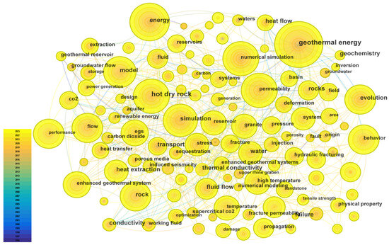 Figure 6 illustrates the keyword co-occurrence network in the field of HDR geothermal energy research, highlighting the relationships among different keywords and the distribution of research hotspots. In this network, the size of the nodes represents the frequency of keyword occurrences in the literature, while the lines connecting the nodes indicate the strength of the associations between keywords. Analyzing the keyword co-occurrence network helps uncover the primary research focuses and development trends in this field. The most central keyword, “Geothermal Energy”, clearly stands as the core research theme in this domain. Studies surrounding geothermal energy encompass various aspects such as its development and utilization, resource assessment, and technological innovations. This keyword is closely linked with other significant terms like “HDR”, “EGS” and “Reservoir”, indicating researchers’ interest in diverse technological pathways for geothermal energy development. “HDR” is a critical resource type in geothermal energy development, particularly in the context of EGS. This keyword is closely connected to terms such as “Thermal Conductivity”, “Fracture”, and “Heat Transfer”, reflecting the research focus on the thermal properties and fracture networks of HDR in high-temperature environments. “Simulation” plays a crucial role in geothermal energy research, particularly in EGS and HDR studies. Simulation techniques are widely used to understand the physical and chemical processes within geothermal reservoirs, including thermal conduction, fluid flow, and stress distribution. Related keywords include “Numerical Simulation”, “Fluid Flow” and “Transport”, collectively demonstrating the application of simulation technologies in predicting and optimizing geothermal system performance. EGS has become a popular research topic in recent years, with EGS technology enhancing reservoir permeability through artificial means, thus enabling the exploitation of HDR resources. Relevant keywords such as “Hydraulic Fracturing”, “Heat Extraction” and “Sequestration” indicate the depth of research into optimizing EGS systems and their environmental impacts. The ‘Hydraulic Fracturing’ cluster (Figure 6) reflects efforts to enhance HDR permeability. The keyword “Heat Transfer” reflects the focus on the process of transferring thermal energy from underground reservoirs to the surface, a process critical to the efficiency of geothermal energy extraction. This is closely related to keywords like “Thermal Conductivity”, “Fluid Flow” and “Granite”, underscoring the importance of studying the physical and material properties that influence heat transfer processes.