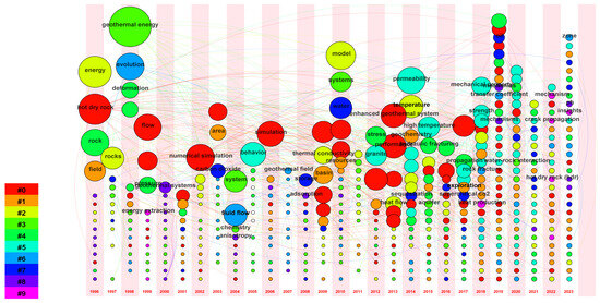 Figure 8 illustrates the evolution of major research hotspots in the field of geothermal energy and HDR over time. Different colored dots represent different research hotspots, with the size of each dot indicating the intensity of research during a specific period, and the position reflecting the year in which the hotspot emerged. By analyzing the temporal evolution of these hotspots, we can anticipate future research trends.