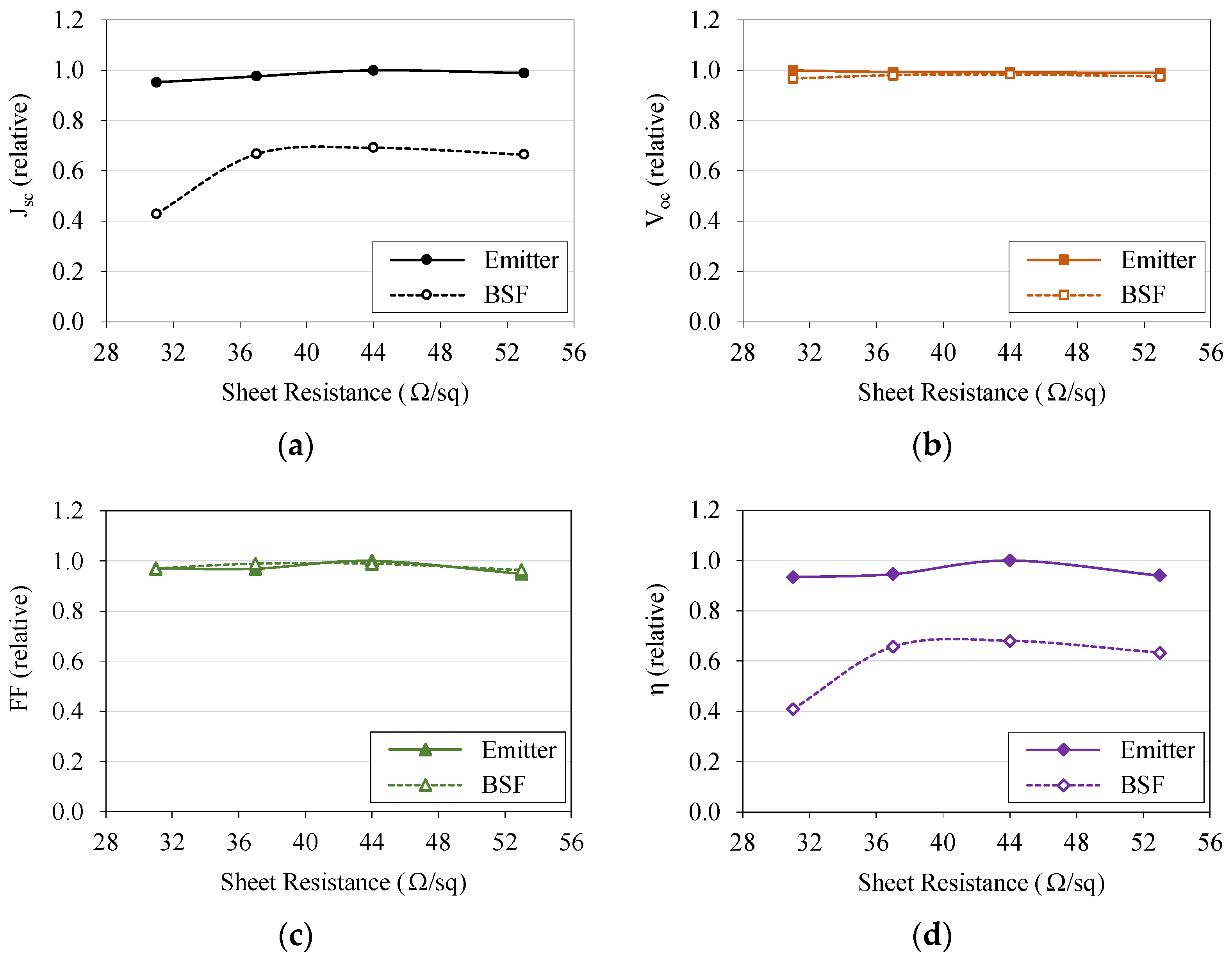 3.2. Influence of the B-BSF Sheet Resistance on Electrical Characteristics