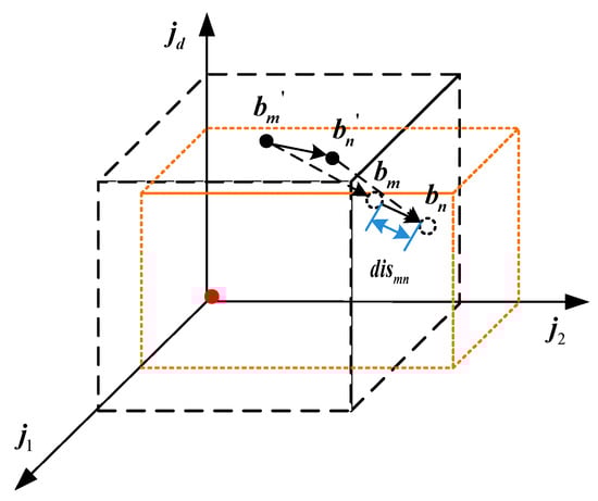 The similarity is represented in the spatial coordinate system as shown in Figure 2. The black dashed line corresponds to the eigenspace coordinate system and d coordinate axes are established for d features, respectively. The coordinate on the feature j axis is . The daily feature coordinate points corresponding to all features on day m and day n are and . The orange dashed line is the weighted eigenspace coordinate system with weights of wj, corresponding to the daily feature coordinate points and . The distance between two points measures the similarity of features between two days.