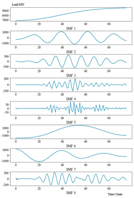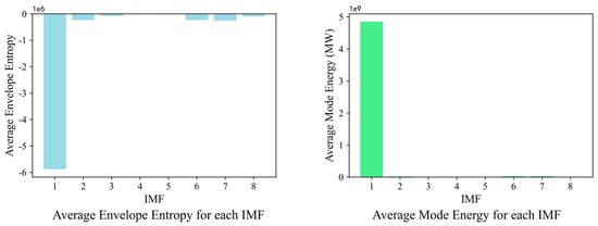 The 96-point load data of all days are decomposed with the BWO-VMD. The optimized number of decomposed sequences is 8, and the penalty coefficient is 50. To verify the validity of the parameters selected by BWO, a sliding window method is used to calculate the average envelope entropy and average energy for each IMF, as shown in Figure 5. From Figure 5, it can be observed that the low-frequency components exhibit lower envelope entropy and higher energy, indicating that these modes effectively capture the main trend components of the signal. In contrast, the high-frequency components show higher envelope entropy and lower energy, suggesting that they primarily capture the high-frequency fluctuations or noise in the signal. Overall, the VMD effectively extracts different frequency band information from the signal, validating the reasonableness of the VMD parameters optimized by BWO.