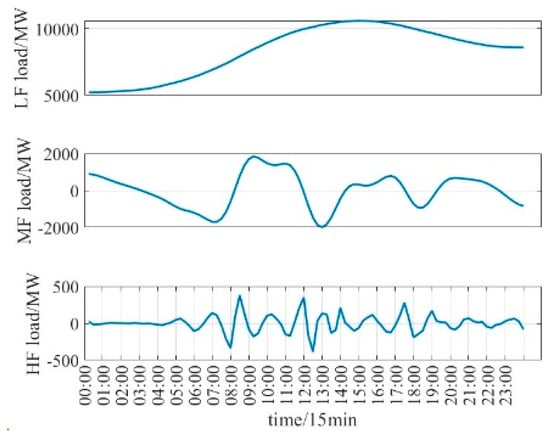 (3) Low-frequency threshold setting: The low frequency component usually corresponds to the long-term trend over the course of a day. In order to extract the main trend of the daily load sequence, then the low frequency threshold can be set to correspond to a 24 h frequency: