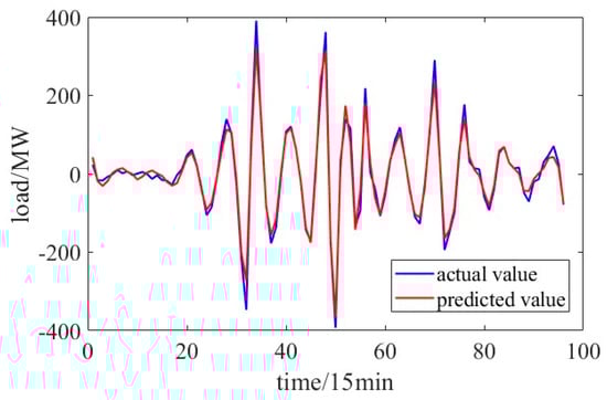 The high-frequency component averages the high-frequency components of the similar days according to the corresponding moments, and it finally adds them to the low frequency component as well as the medium frequency component to obtain the final prediction. In this case, the predicted and actual comparison of the high-frequency component using the similar day averaging method is shown in Figure 9.