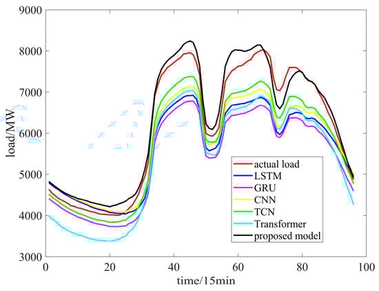 In order to verify the superiority of the method proposed in this paper, in this section, 5 models (LSTM, GRU, CNN, TCN, Transformer) are used as comparison models to evaluate the performance of the forecasting model. They are compared in terms of MAPE, RMSE, computation time, and CPU usage. The predicted results for a typical day (18 February 2014) are shown in Figure 12. To verify the consistency of the model across different days, predictions are made for each of the 20 randomly selected days throughout 2014. They include weekdays and holidays from all four seasons of the year. The prediction results are shown in Table 6 and the computation time and CPU usage are shown in Table 7.