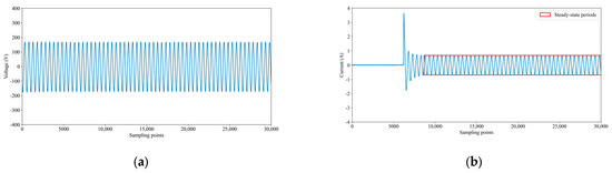 - Normalize the voltage and current values within a steady-state period to the range using the following formula:where and represent the normalized voltage and current values, respectively, at the th sampling point, and and are the maximum and minimum voltage values, respectively, within the steady-state period.