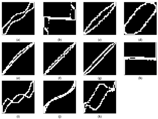 The binary V-I trajectory images (q = 32) of 11 appliances from the PLAID dataset: (a) Air Conditioner (AC); (b) Compact Fluorescent Lamp (CFL); (c) Fan; (d) Fridge; (e) Hairdryer; (f) Heater; (g) Incandescent Light Bulb (ILB); (h) Laptop; (i) Microwave; (j) Vacuum Cleaner (VC); (k) Washing Machine (WM).