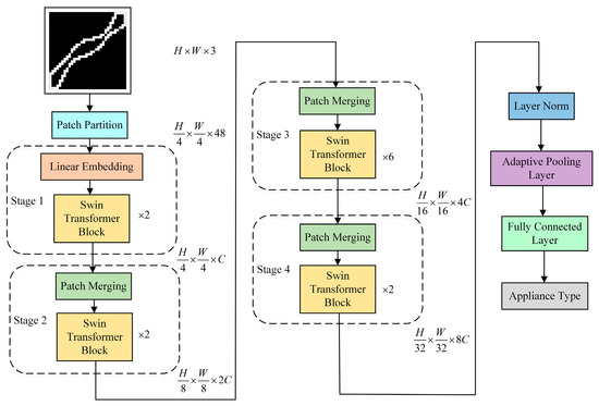 In the second stage, downsampling is performed through a patch merging layer. Features from each patch are concatenated, increasing the channel dimension to . Subsequently, a linear layer is applied to reduce the channel dimension to , resulting in a feature dimension of . The transformed features are then processed by the Swin Transformer block for further transformation. The third and fourth stages repeat the procedure of the second stage, progressively generating hierarchical feature representations with dimensions of and respectively. Following the fourth stage, a layer normalization (LN) layer, an adaptive pooling layer, and a fully connected layer are sequentially applied. The network ultimately outputs the predicted appliance type.