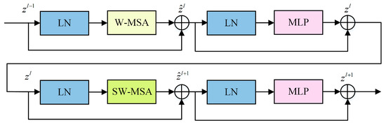 As shown in Figure 5, each Swin Transformer block comprises the following components: window-based multi-head self-attention (W-MSA) layer, shifted window-based multi-head self-attention (SW-MSA) layer, LN layer, and multilayer perceptron (MLP) layer.
