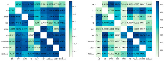 Figure 7 shows the Q-statistic and DF values of the nine learners on the PLAID dataset. Due to the significant differences in training mechanisms between LR, NB, KNN, and the other learners, their diversity is higher, resulting in substantially lower Q-statistic and DF values. RF, Adaboost, GBDT, and XGBoost all employ DT as the base learner, leading to strong similarities in their data analysis approaches, which explains their higher Q-statistic and DF values. Among these, RF utilizes a parallel ensemble method, while Adaboost, GBDT, and XGBoost employ serial ensemble methods.