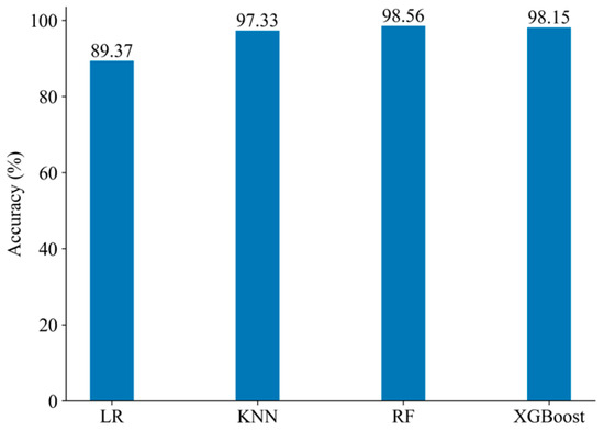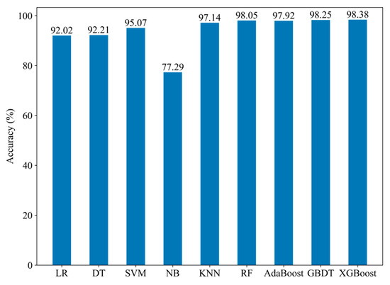 Figure 8 shows the accuracy of individual learners. Compared to the other eight learners, NB has relatively low accuracy and poorer classification performance. After removing NB, the accuracy of the learner combination increases from 97.79% to 98.77%. This indicates that learners with significantly different accuracy levels from others may also negatively impact the ensemble results. In summary, LR, KNN, Adaboost, and GBDT are chosen as the learners for the preliminary load identification using one-dimensional numerical features.