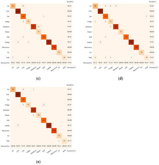 By comparing the classification results on the PLAID and WHITED datasets, it is observed that the proposed method demonstrates strong cross-dataset adaptability. In tests on both datasets, the F-scores for all appliance categories consistently remained above 94%, reflecting a high level of performance. These experimental results provide strong evidence that the proposed multivariate feature fusion strategy, based on the collaboration of multiple classifiers, offers significant advantages over traditional single-dimensional feature methods. It effectively addresses scenarios involving a large variety of appliance types and multiple brands within the same appliance category.