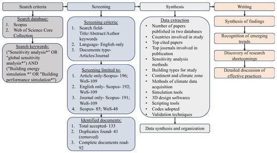 This systematic review followed a methodology to identify relevant papers from previously published works on the topic of sensitivity analysis of the building’s thermal energy performance. Two databases, namely Scopus and Web of Science (WoS) core collection, were selected for the search strategy on 2 September 2024. The search was based on keywords (“Sensitivity analysis” OR “global sensitivity analysis” AND “Building energy simulation OR Building performance simulation”) in the title, abstract, and keyword field of both databases. A total of 92 published papers in Scopus and WoS were thoroughly analyzed for review assessment. The whole methodology illustrating the identification, screening, inclusion, and exclusion process is shown in Figure 3.