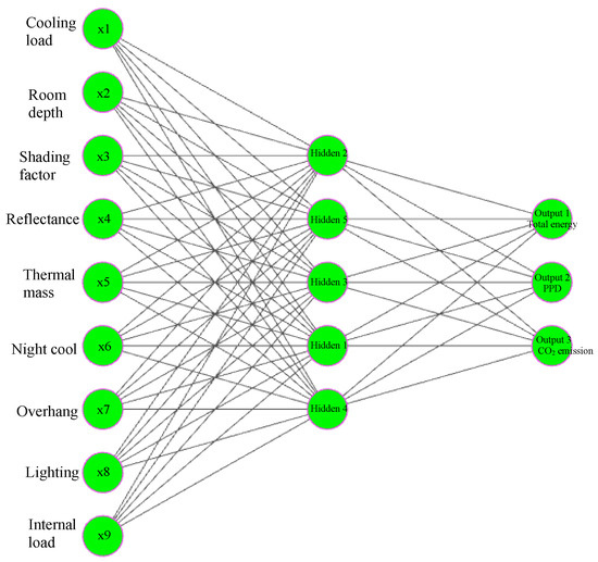 Besides the above methods, the surrogate model, also called a metamodel, assesses a simple solution for the complex physics-based building model as an alternative option. The surrogate model is useful when the whole building energy model is computationally expensive. It can be combined with the GSA techniques for efficient sensitivity analysis. Several researchers used a surrogate model as a higher-order model for sensitivity analysis of the building energy performance [62,65]. Techniques such as artificial neural networks (ANNs) [68] and genetic algorithms [69] are also used to map input data to output. Figure 9 shows one of the surrogate models, an artificial neural network (ANN), applied to the building energy model, showing the input variables and the output performance parameters. The model comprises seven input parameters affecting energy consumption, thermal comfort, and carbon emissions. ANN provides an alternative to traditional building simulation tools such as EnergyPlus and TRNSYS, using a data-driven approach by learning patterns from historical or simulated data.