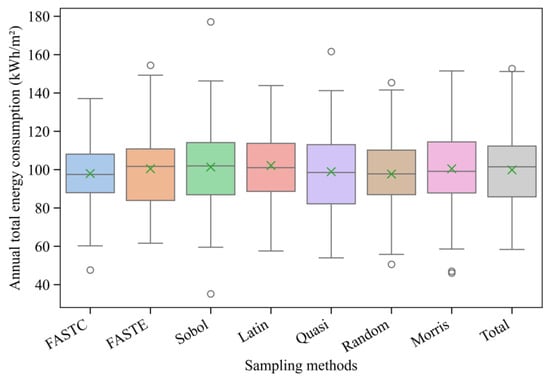 On the other hand, the sample size in SA is an essential factor to be considered to obtain accurate, reliable, and computationally efficient results. An appropriate sample size is required to ensure that the model accurately captures the influence of input parameters and interactions. The choice of sample size for SA is presented in the literature. As a starting point, a rule of thumb can estimate the sample size. Sample size N is at least 10 times the number of input factors (x). However, this is not sufficient for highly nonlinear models. For variance-based methods, Monte Carlo-based sampling can be used with N in the range of 1000 to 10,000 or even more. That depends upon the complexity of the model and input parameters. For Sobol’s indices, the total number of model evaluations is determined by N(x + 2), where x is the number of input factors. Asadi et al. [77] used the Monte Carlo sampling techniques to run 70,000 energy models with different input samples to simulate the effects of building shape on energy performance. For Morris screening, a typical sample size N is r(x + 1), where r is the number of trajectories (r = 10 to 50). In LHS, N is commonly used N ≥ 100 to N ≥ 1000, depending on the desired accuracy and number of inputs. Zhu et al. [32] generated 2090 samples, which are 190 times the input variables, to estimate the cooling and heating loads of the building using LHS sampling methods. Figure 11 illustrates different sampling techniques for the sensitivity analysis of the total building energy consumption. The median values obtained by various sampling techniques are almost similar; however, the upper and lower quartiles and minimum and maximum values show significant differences.