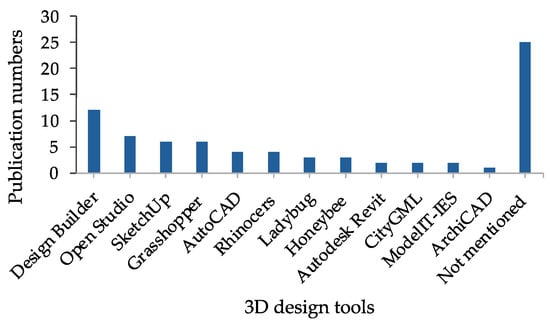 Figure 13 illustrates the 3D design software that supports geometry design using other simulation software as a calculation engine. DesignBuilder is the most popular 3D design tool and uses EP as a calculation engine [83]. OpenStudio is a graphical user interface (GUI) for EP designed to work with SketchUp. SketchUp, Grasshopper, Autodesk, and CityGML are other 3D design tools widely used in conjunction with other energy simulation software.