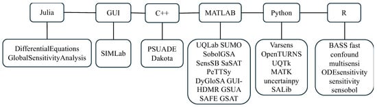 Open-source sensitivity analysis software tools available based on the programming language and the methods they support.