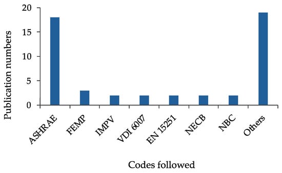 Following the codes in building energy simulations is necessary to meet the specific energy efficiency and performance standards. The codes are detailed, structured guidelines in compliance with energy standards to optimize the building designs for energy efficiency. Figure 16 illustrates the codes and standards that are most frequently used in the articles for the study. Codes often share mandatory compliance requirements in many cases and baseline performance metrics in some cases, against which the proposed design of buildings will be evaluated. Simulation results should exhibit that new designs of buildings meet or comply with these requirements quoted by codes. For instance, ASHRAE developed and formulated the standards and guidelines that are broadly administered and executed in the building energy efficiency sector [91]. ASHRAE periodically publishes and updates standards and guidelines related to HVAC systems.