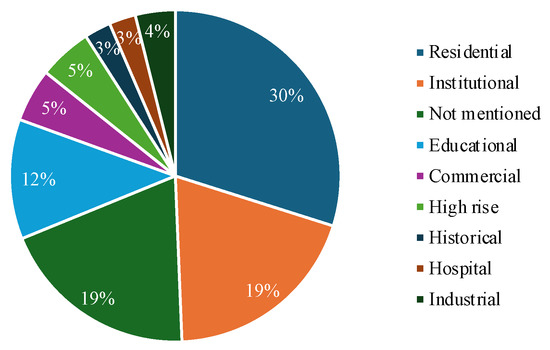 Building stocks’ heating and cooling energy demand accounts for 40% of the total energy demand [95]. The review identified the various building typologies analyzed for SA studies. The following distribution of studies was identified: residential buildings (30%), institutional buildings (19%), educational buildings (12%), and the remaining categories. The demand for heating and cooling in hospitals, institutional, and commercial buildings is generally high and cannot compromise indoor thermal comfort and air quality. Thus, more studies are needed to reduce the energy demand by optimizing the use of energy resources and building components. Figure 17 illustrates different building typologies analyzed for BTEM in the reviewed studies. Fewer studies have been conducted on commercial, industrial, and hospital buildings than on residential, institutional, and educational buildings. However, these sectors contribute to a higher energy demand rate for heating and cooling than residential buildings. Bugenings et al. [53] studied a novel solution for school renovation by replacing the conventional retrofitting system with a combination of diffuse ceiling ventilation and a double skin façade. The result shows an 11% lower energy demand than the traditional renovation system by achieving equal indoor air quality and thermal comfort. Himmetoğlu et al. [38] studied a hospital building using a multi-objective approach to determine the most suitable green envelope design for building energy demand.