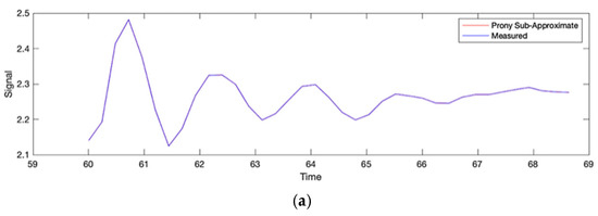 Prony’s method is essentially based on the following model [51,52,53,54]. Let be a signal consisting of N evenly spaced samples. Prony’s method fits a function: