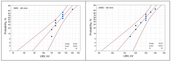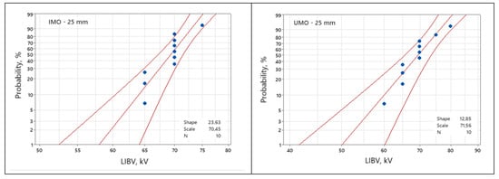 The obtained LIBV results were subjected to statistical processing. In many studies, authors try to find an appropriate statistical distribution that reflects their observations in the best way. When analyzing values of 50% breakdown probability, results for individual statistical distributions do not differ significantly. From a technical point of view, values for low percentiles (e.g., 5% breakdown probability) are interesting due to the fact that they may be treated as the so-called withstand voltage [36,37,38]. Many conducted studies confirm the hypothesis that the Weibull distribution function is a suitable function for the statistical processing of data on LIBV [39,40]. Hence, for the purposes of this research, the analysis of obtained results was performed using the two-parameter Weibull distribution.