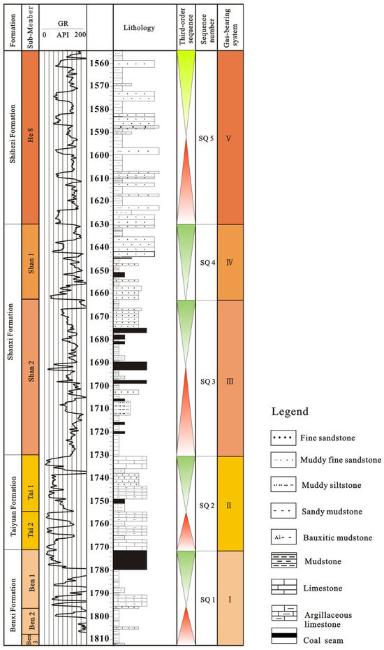 The Carboniferous to Permian strata in the Daning–Jixian Block comprise predominantly continental to transitional facies of coal-bearing sandstones and mudstones intercalated with marine layers. Permian sequences are dominated by continental deposits, while transitional facies and marine limestones are primarily developed in the lower Benxi and Taiyuan Formations. This study focuses on five sets of target layers: the Benxi Formation, the Taiyuan Formation, the Shan 2 and Shan 1 Members of the Shanxi Formation, and the He 8 Member, corresponding to five third-order sequences (SQ1-SQ5) (Figure 1).