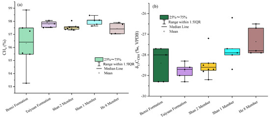 CH4 concentration and δ13CCH4 values in each gas-producing layer. (a) CH4 concentration values in each gas-producing layer; (b) δ13CCH4 values in each gas-producing layer.