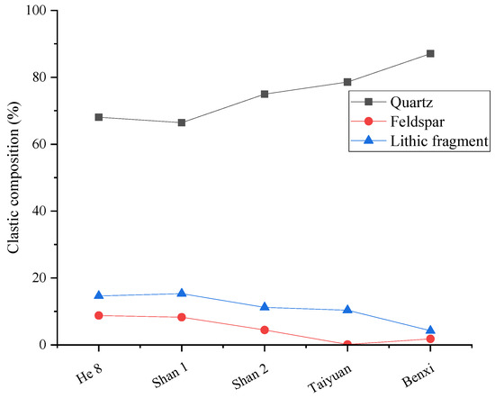 Thin-section analysis reveals the compositional characteristics of sandstones across stratigraphic units in the study area as follows. Benxi Formation sandstones exhibit quartz content of 87.07%, feldspar content of 1.77%, lithic fragment content of 4.23%, and minor matrix/cement, classifying as quartz sandstone. Taiyuan Formation sandstones contain 78.57% quartz, 0.11% feldspar, 4.23% lithic fragments, low matrix content, and moderate cementation, dominated by quartz sandstone with subordinate lithic quartz sandstone. Shan 2 Member sandstones comprise 74.95% quartz, 0.44% feldspar, and 11.2% lithic fragments, primarily lithic quartz sandstone and quartz sandstone, characterized by a relatively high content of matrix. Shan 1 Member sandstones show 66.44% quartz, 8.25% feldspar, and 15.32% lithic fragments, dominated by lithic quartz sandstone and quartz sandstone. He 8 Member sandstones contain 68.06% quartz, 8.77% feldspar, and 14.63% lithic fragments, predominantly lithic quartz sandstone and quartz sandstone (Figure 4).
