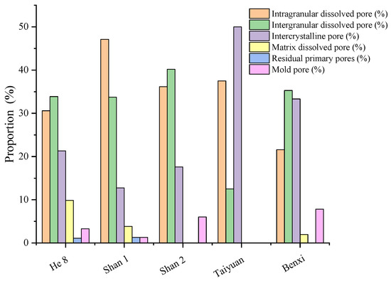 Extensive studies have been conducted on pore types within the Carboniferous–Permian tight sandstone reservoirs of the Daning–Jixian Block [27,28,29], with dissolution pores identified as the dominant pore type [30]. This study statistically analyzes pore characteristics across tight sandstone gas reservoirs using cast thin-section data. The results reveal that reservoirs from the Benxi Formation to the He 8 Member are predominated by intragranular and intergranular dissolution pores, with subordinate occurrences of intercrystalline pores. In terms of pore area percentage, the He 8 and Shan 2 Members exhibit relatively higher values (4.41% and 4.91%, respectively), while the Shan 1 Member and the Taiyuan Formation display lower percentages (Table 4; Figure 6).