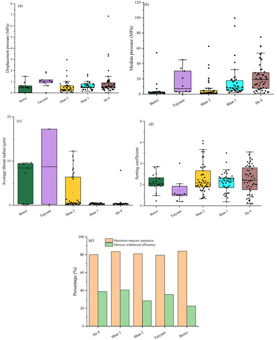Guo et al. [31] statistically analyzed mercury injection capillary pressure (MICP) curves from numerous samples of the main sandstone reservoirs in the Daning–Jixian area, concluding that the Benxi Formation and Shan 23 Sub-Member exhibit well-developed pore throats conducive to fluid flow, while other layers display inferior throat connectivity. This study further compiles and compares MICP parameters from 170 sandstone samples across the study area (Table 5). The results indicate that the Taiyuan Formation reservoirs exhibit the highest average displacement pressure (1.06 MPa) and median pressure (15.39 MPa), followed by the He 8 and Shan 1 Members, while the Shan 2 Member and the Benxi Formation show relatively lower values (Figure 7a,b). From the He 8 Member to the Benxi Formation, the average throat radius progressively increases (Figure 7c). The Taiyuan Formation displays a markedly lower average sorting coefficient compared to other units, suggesting more uniform pore-size distributions (Figure 7d). Although the average maximum mercury saturation varies minimally among units, the average mercury withdrawal efficiency decreases with increasing stratigraphic depth (Figure 7e).