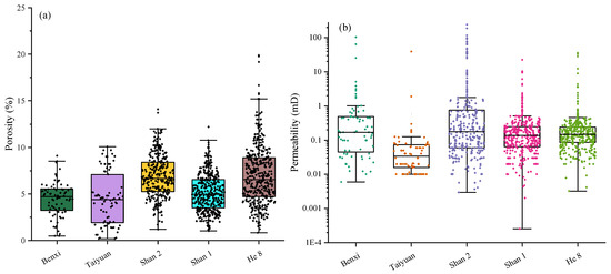 Core petrophysical analyses reveal comparable porosity values but significant permeability disparities across the Benxi Formation to the He 8 Member. Porosity in units from the Benxi Formation to the He 8 Member primarily ranges between 1 and 10%, with an average of 4.5%, 4.5%, 5.9%, 4.8%, and 5.8% for the five sets of strata, respectively (Figure 8a). In contrast, permeability in the He 8 Member, Shan 1 Member, and Taiyuan Formation is notably low (0.005–10 mD), averaging 0.52 mD, 0.39 mD, and 0.58 mD, respectively. The Shan 2 Member and the Benxi Formation exhibit higher permeabilities (0.01–100 mD), with averages of 5.72 mD and 3.04 mD. Despite minor porosity variations, a subtle decreasing trend in porosity with depth is observed. The superior permeability in the Shan 2 Member, followed by the Benxi Formation, is attributed to depositional setting and diagenetic features [32] (Figure 8b).