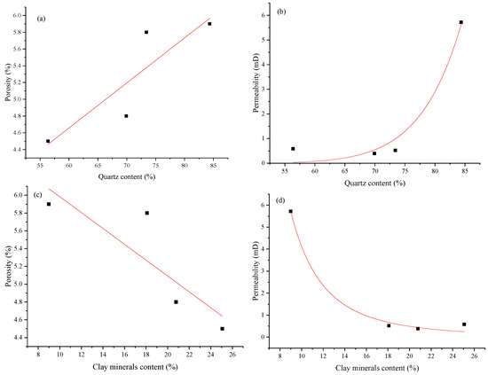 Quartz–clay mineralogical controls on porosity–permeability trends in tight sandstone reservoirs. (a) Quartz content controls on porosity trends in tight sandstone reservoirs; (b) quartz content controls on permeability trends in tight sandstone reservoirs; (c) clay content controls on porosity trends in tight sandstone reservoirs; (d) clay content controls on permeability trends in tight sandstone reservoirs.