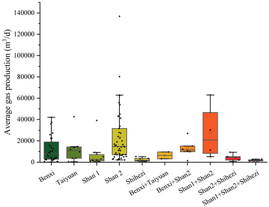 Shihezi + Shan 1 + Shan 2 co-production: The average yield of 1736.80 m3/d (1087.74–2984.00 m3/d) underperforms all individual layers (Figure 11).