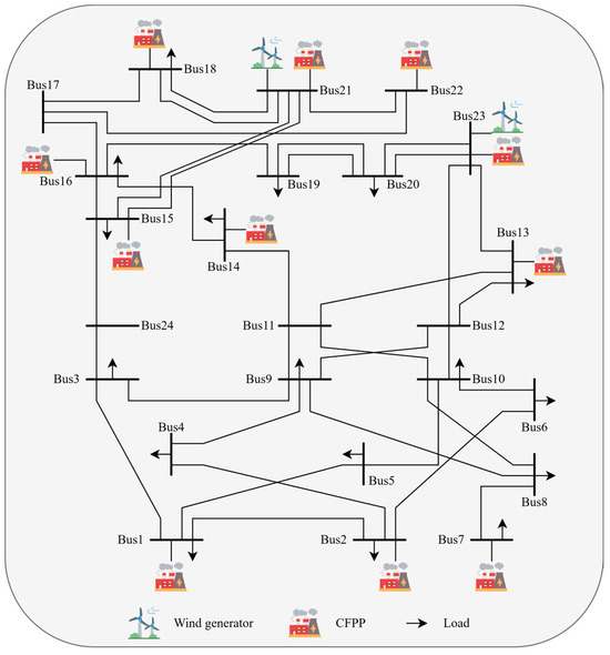 The IEEE RTS 24-bus test system (as depicted in Figure 3) was employed to validate the efficacy of the proposed model [26]. This power system comprises 32 CFPPs, with a total capacity of 3650 MW, and four wind farms, totaling 400 MW [27,28]. To streamline the computation, the planning period was defined as a five-year interval. Investments in wind generators, energy storage systems, and the transformation of CFPPs were assumed to be completed within the initial year of each stage. The total planning horizon encompassed 15 years (NT = 3), with each stage represented by a single typical day of 24 h (NK = 24). The parameters associated with the coal-fired power plants are detailed in Table 1. The investment in renewable energy resources is limited to the deployment of wind turbine generators. Parameters pertinent to the renewable energy resources and energy storage systems are presented in Table 2.