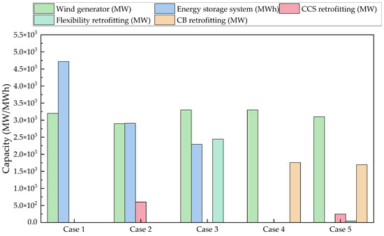 Case 4: This case evaluates CB retrofitting. Relative to Case 1, the wind generator capacity increases by 100 MW and the CB retrofitting capacity increases by 1758 MW. The energy storage system capacity decreases by 4719 MWh. The total cost decreases by 24.27%, and carbon emissions decline by 0.36%. The CB retrofit preserves grid-regulation flexibility and improves energy utilization efficiency. By replacing the need for separate storage, it lowers the total cost, although its lower round-trip efficiency limits emission reductions.