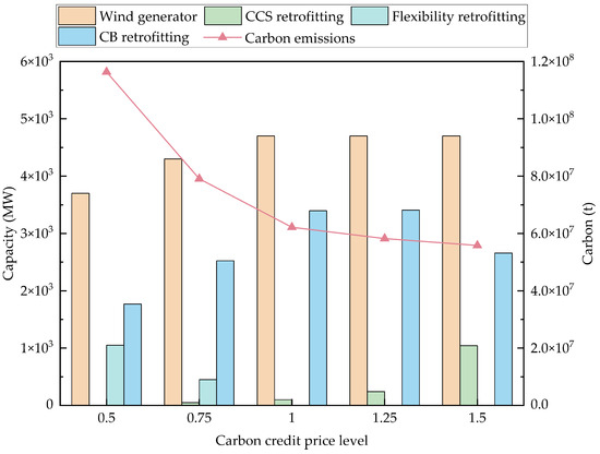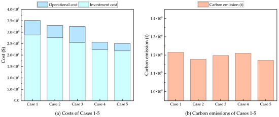 Case 3: This case investigates the effect of flexibility retrofitting. Relative to Case 1, the wind generator capacity increases by 100 MW and the flexibility retrofitting capacity increases by 2441 MW. The energy storage system capacity declines by 2427 MWh. The total cost decreases by 7.43%, while carbon emissions decline by 1.21%. The flexibility retrofitting enhances the plant’s regulation capability and improves the integration of renewable energy. However, the requirement to maintain a minimum output for system stability constrains achievable emission reductions.