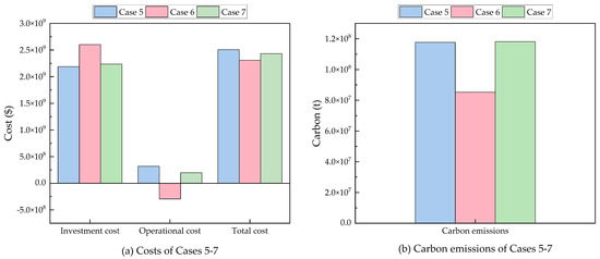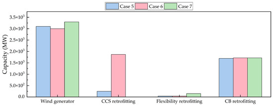 Case 6: This case extends Case 5 by integrating the CET market. Figure 6a,b present the cost and emission results for Cases 5–7, while Figure 7 details the installed capacities. Compared to Case 5, the CCS retrofitting capacity increases by 1620 MW, resulting in a 7.97% reduction in total cost and a 27.52% decrease in carbon emissions. Investment costs increase by 412.8 M$, whereas operating expenses decrease by 612.6 M$ and emissions decline by 32.4 Mt. These changes enable the acquisition of surplus emission allowances, yielding a net financial benefit.