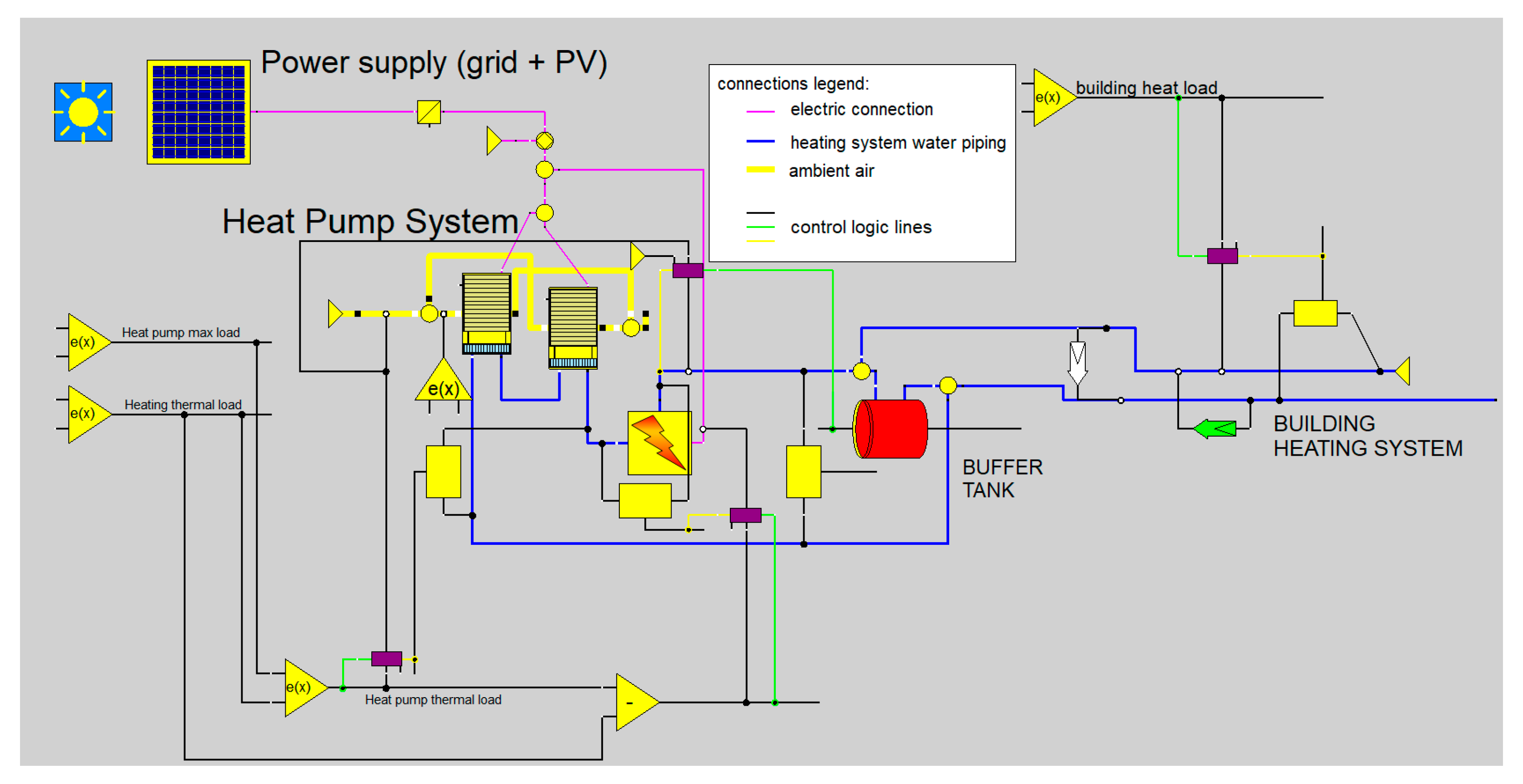 - The heating system piping, using water as the heat transfer medium, represented by the blue line. This system represents the hydraulic connection of heat pump system. Peak heat source—district heating, buffer tank, and connection to the building heating system. Heat sources deliver the heat to the water connected to the buffer tank. The temperature of the medium is set to be 5 K higher than the tank temperature. Increasing the overheat would lead to higher heat pump temperature lift, causing a decrease in efficiency. The heating system in the building is controlled by the building’s heat load. The temperature drop in the system is set to a constant value of 12 K, corresponding to ISO 52016-1:2017 [63] for a floor heating system.