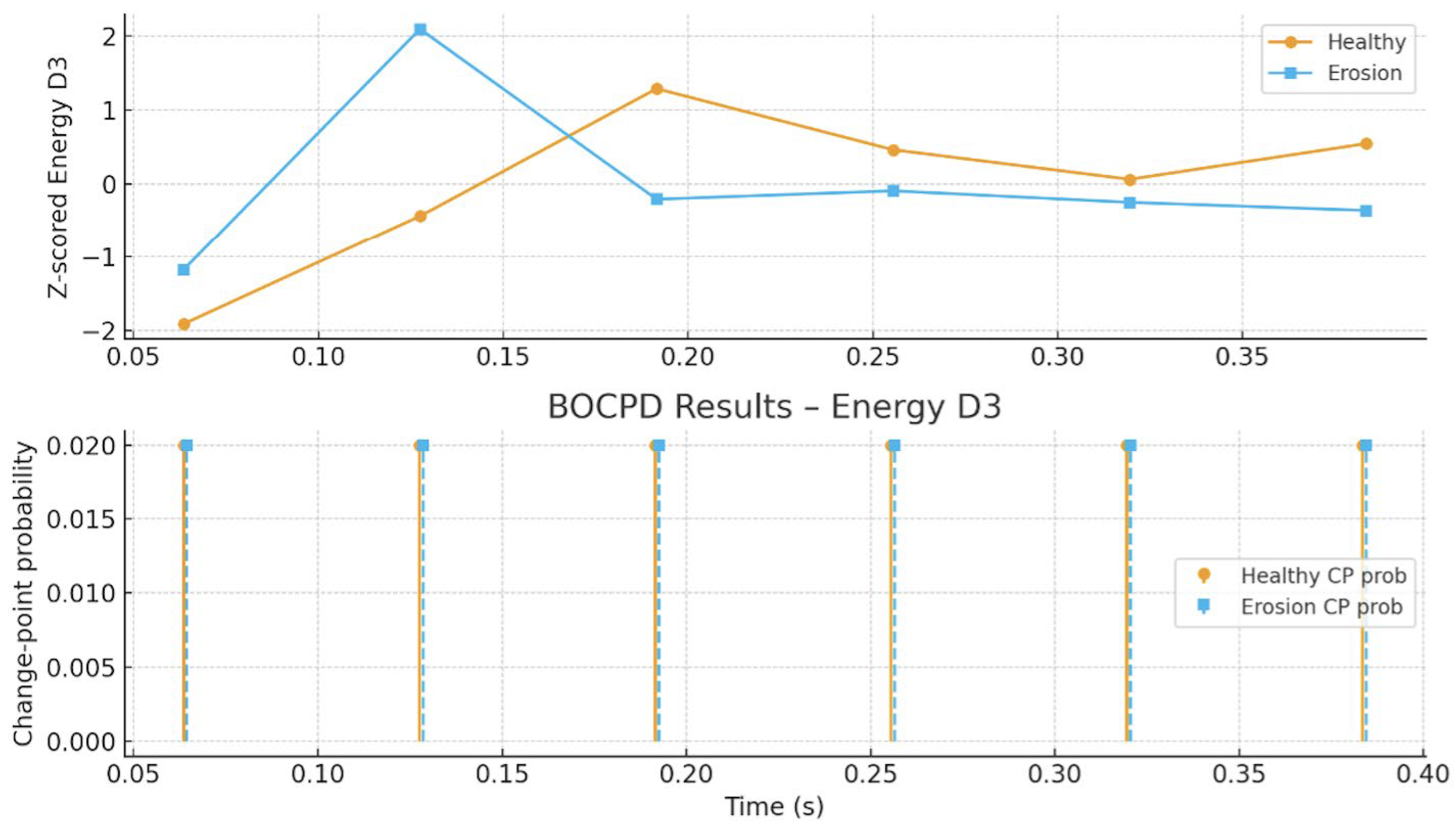 | Main plot observations | Stable separation in DWT energy trends; BOCPD shows no distinct internal change points | Energy consistently higher; centroid exhibits sharp local spikes; CUSUM shows clear divergence |