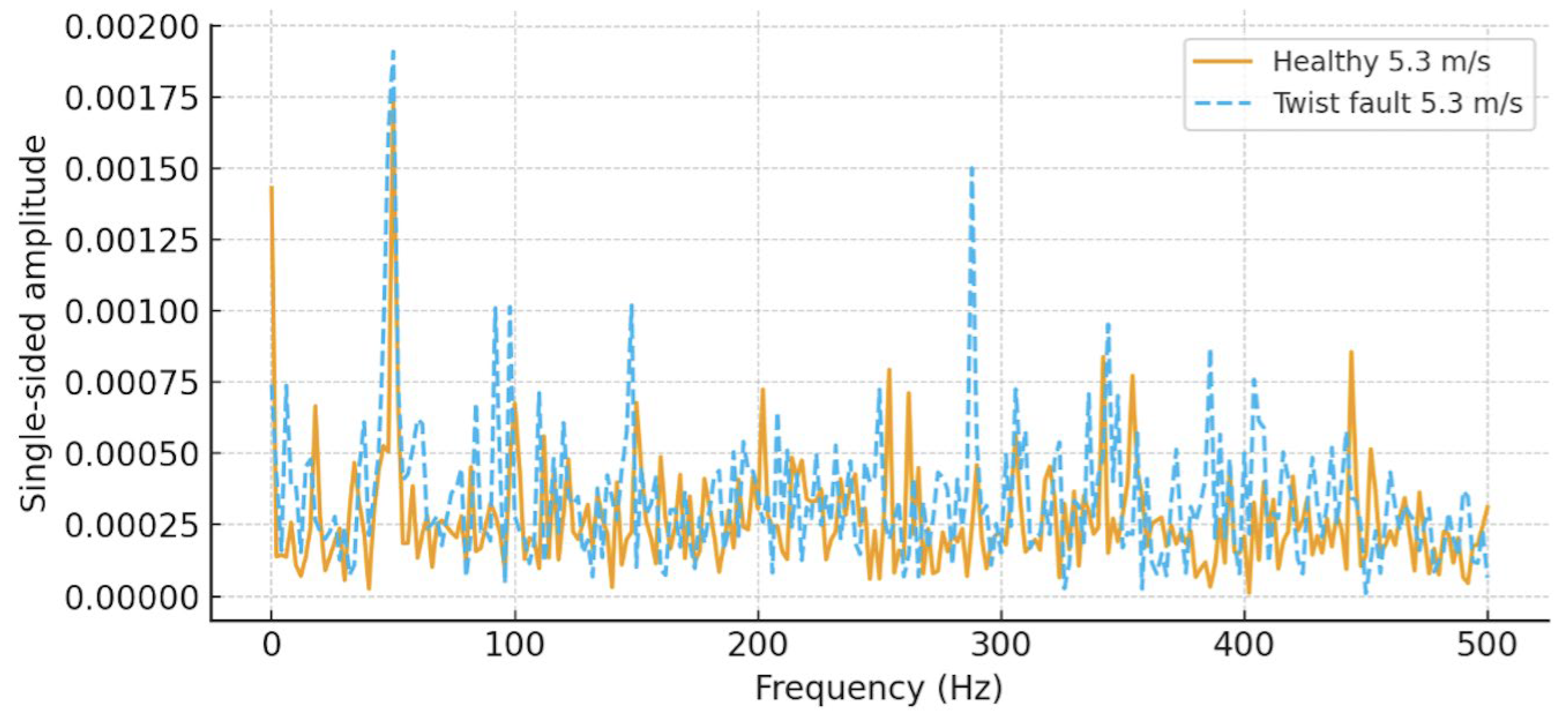 - Twist misalignment detection using FFT–CUSUM integration: FFT, well suited for resolving harmonic behavior, is integrated with the CUSUM algorithm to capture the subtle spectral redistribution and instability caused by aerodynamic imbalance.