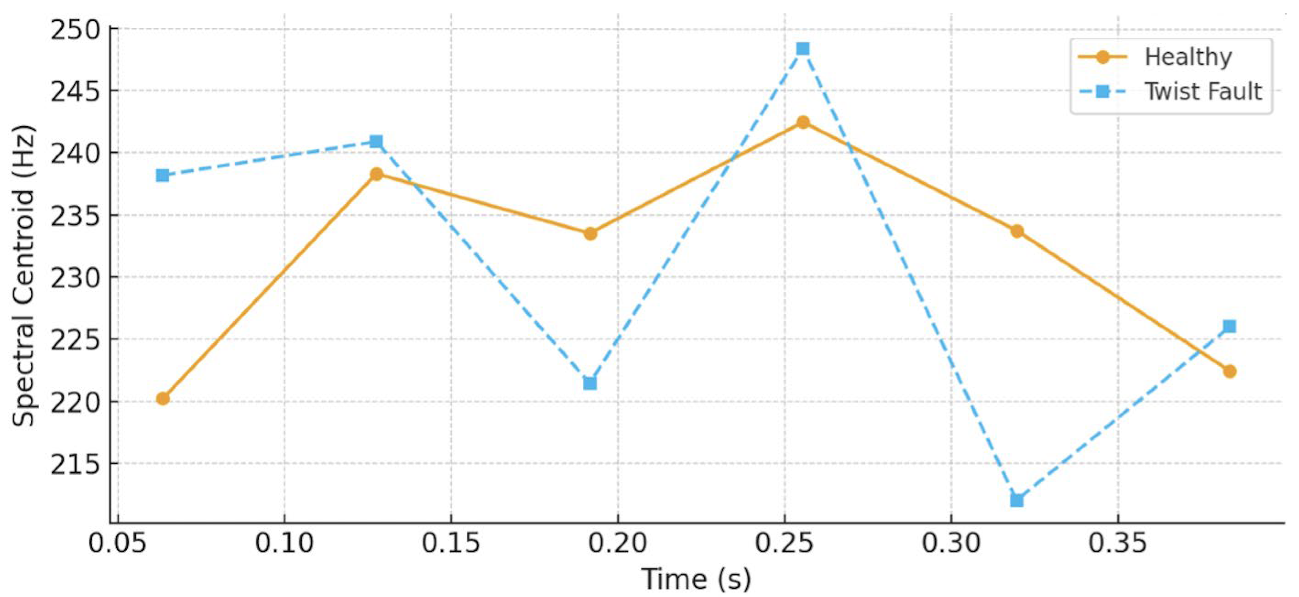 - Case 2—Twist misalignment: The short-time Fast Fourier Transform (FFT), effective for capturing harmonic behavior, is combined with the CUSUM algorithm to identify the spectral redistribution and instability associated with aerodynamic imbalance.