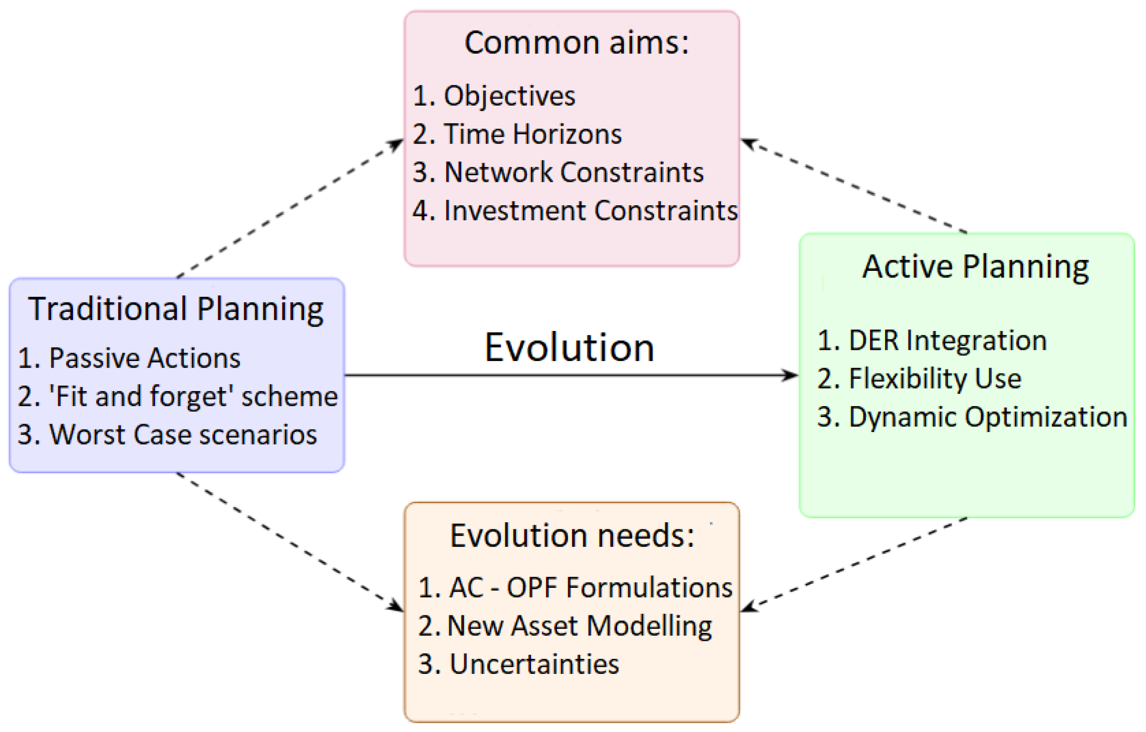 - A comprehensive review of key concepts in passive and active distribution system planning, covering time horizons, objectives, decision variables, and technical constraints. This is supplemented by a comparison of different OPF formulations, uncertainty techniques, and flexible planning tools.