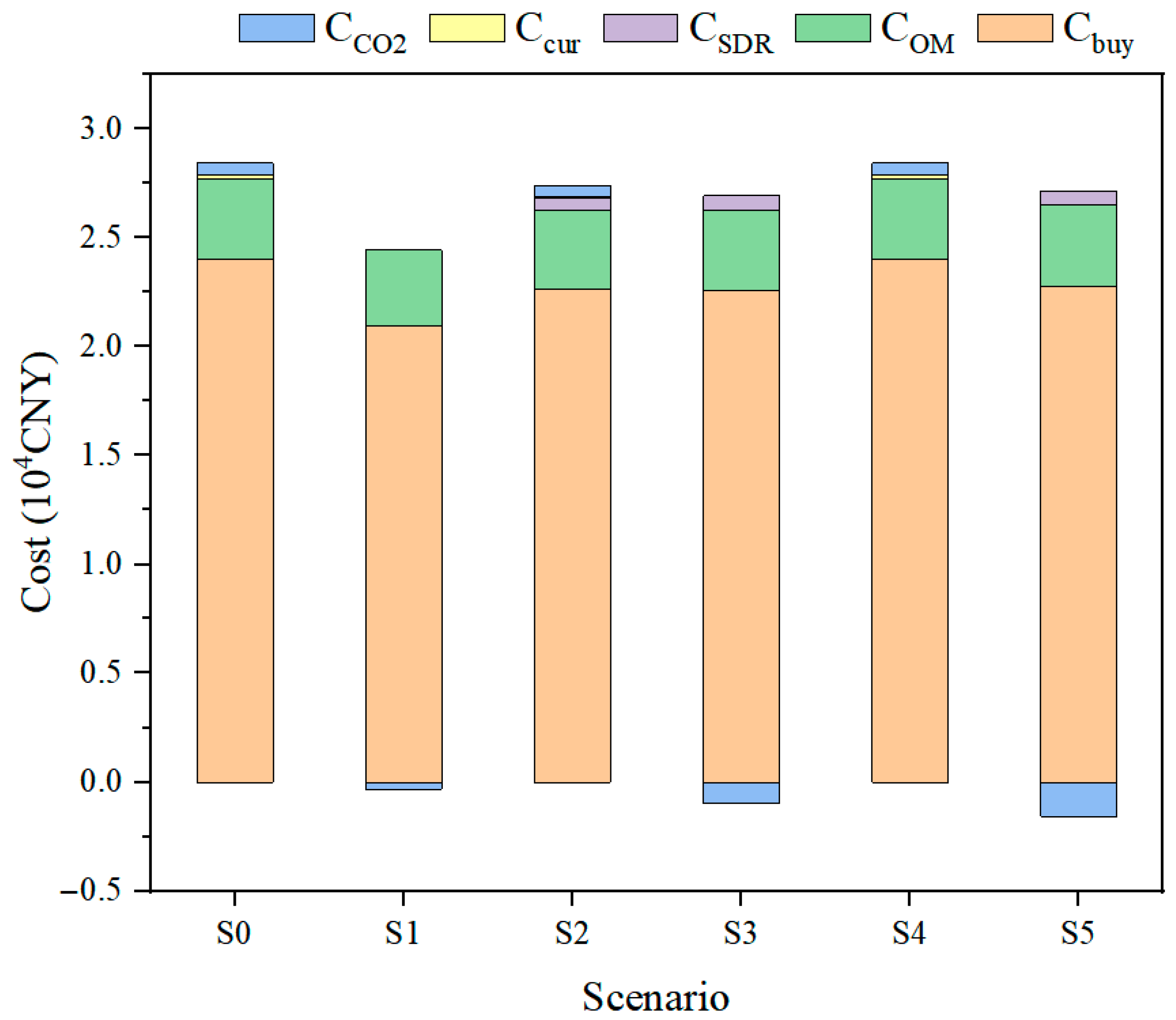 | Scenario | Total Cost (CNY) | Cost Reduction vs. S0 | Carbon Emissions (t) | Emission Reduction vs. S0 | RE Utilization (%) |